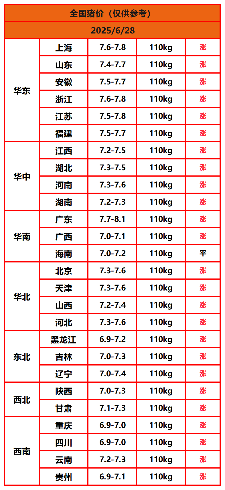 2025年6月28日猪价,今日全国猪价行情走势:25涨1平0跌。