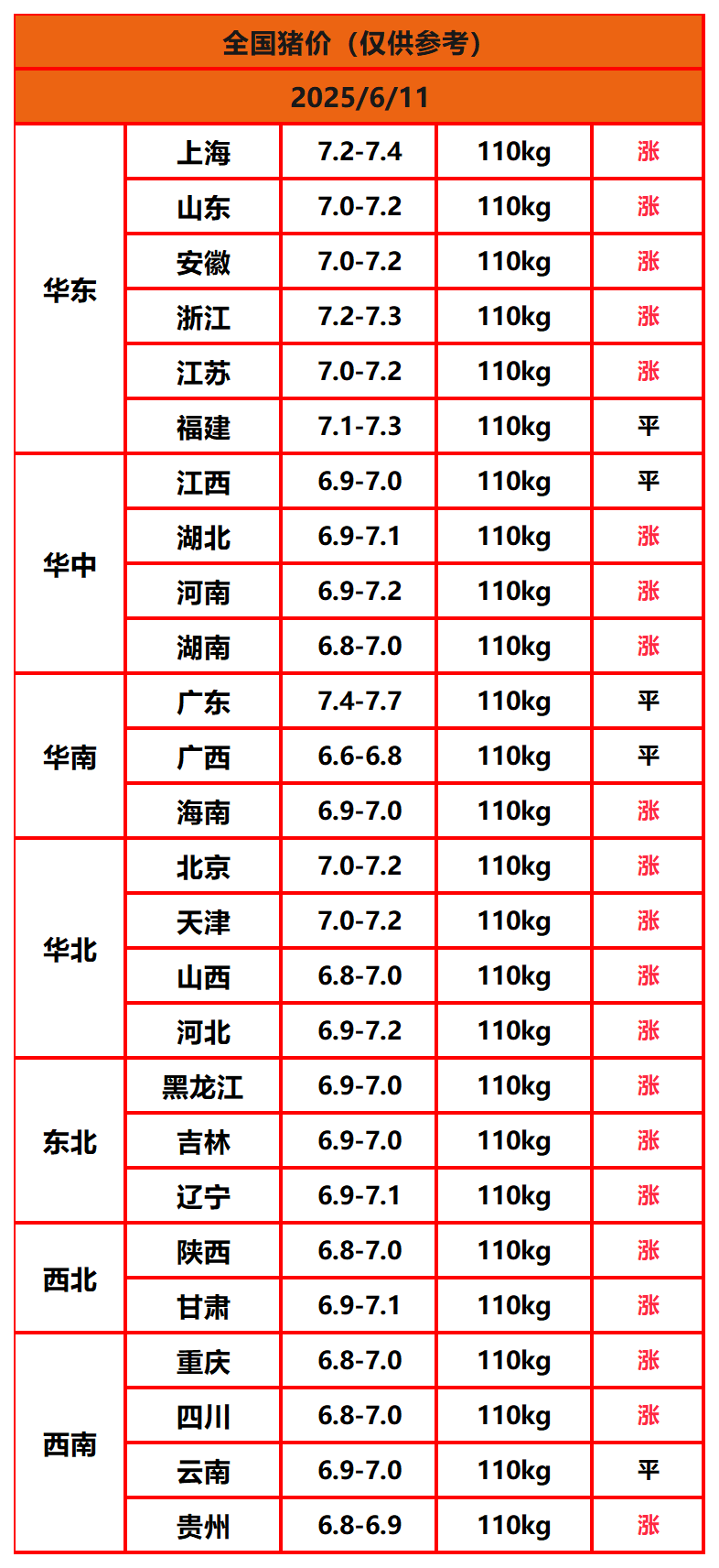 2025年6月11日猪价,今日全国猪价行情走势:21涨5平0跌。