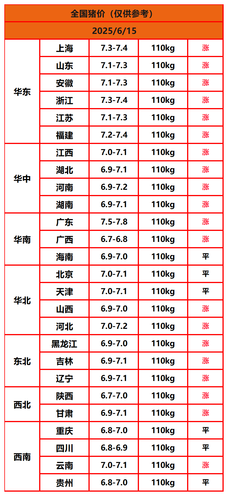 2025年6月15日猪价,今日全国猪价行情走势:20涨6平0跌。